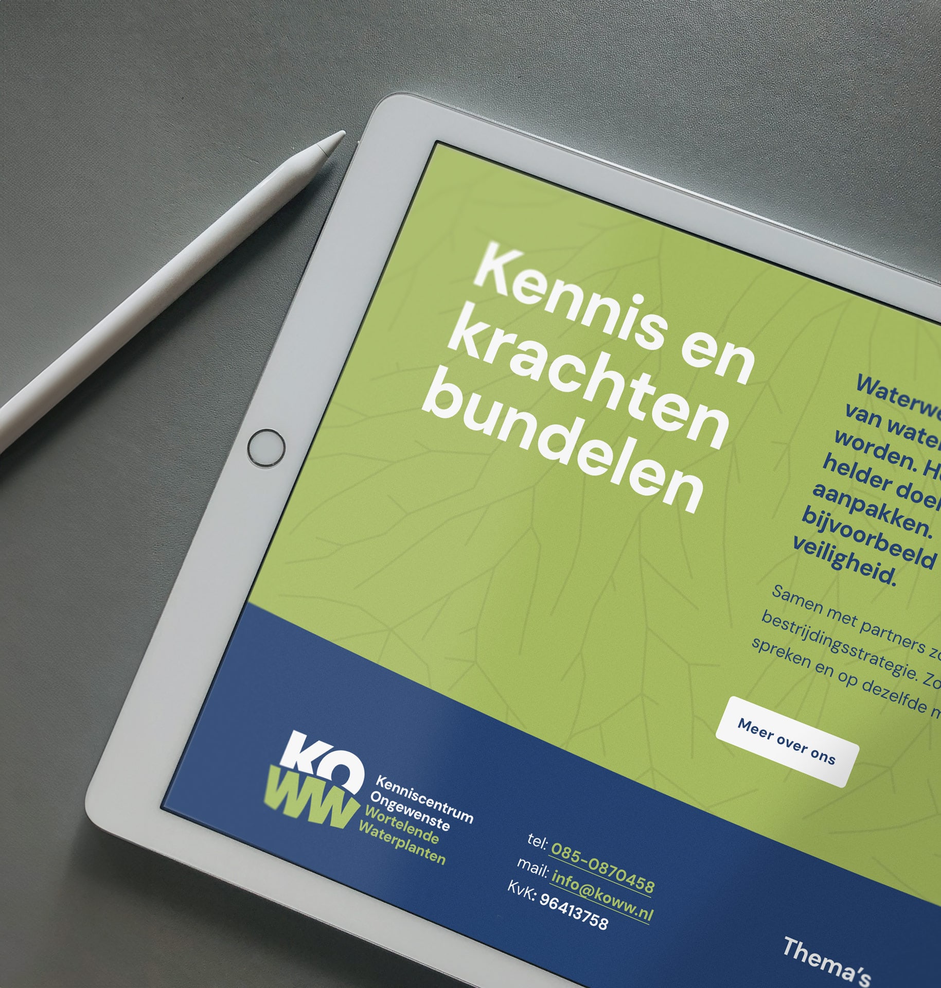Het Kenniscentrum Ongewenste Wortelende Waterplanten (KOWW) streeft naar een duurzaam en effectief beheerbeleid voor woekerende waterplanten. De stichting wil kennis en krachten bundelen via hun platform om tot een duurzame aanpak te komen voor het onderhouden van watergebieden. Voor KOWW hebben we het logo en de huisstijl ontworpen. We hebben een online platform ontworpen en gebouwd met als kern het delen van onderzoek en kennisartikelen op diverse thema's.
